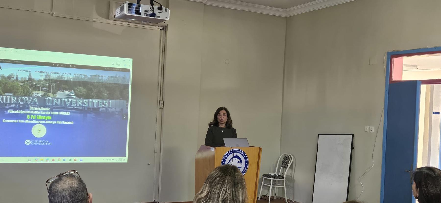Yapılan ziyarette Fakültemiz personeline Kalite Yönetim Sistemi, Yükseköğretim Kalite Kurulu (YÖKAK) Ölçütleri YÖKAK 2025 Ara Değerlendirme Raporunda tespit edilen gelişmeye açık yönlerimizin güçlü yönlerimize dönüştürülmesi için yapılması gerekenler; ders içerikleri, ders öğretim ve ölçme sistemlerinin kalite süreçleri ile uyumu, PUKÖ döngüsünün önemi, kalite anlayışının özümsenmesi konularında bilgilendirme yapılmıştır.