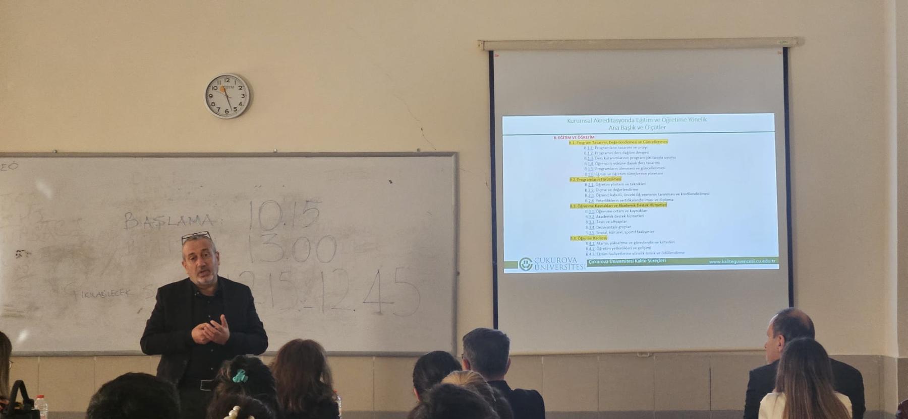 Yapılan ziyarette Fakültemiz personeline Kalite Yönetim Sistemi, Yükseköğretim Kalite Kurulu (YÖKAK) Ölçütleri YÖKAK 2025 Ara Değerlendirme Raporunda tespit edilen gelişmeye açık yönlerimizin güçlü yönlerimize dönüştürülmesi için yapılması gerekenler; ders içerikleri, ders öğretim ve ölçme sistemlerinin kalite süreçleri ile uyumu, PUKÖ döngüsünün önemi, kalite anlayışının özümsenmesi konularında bilgilendirme yapılmıştır.