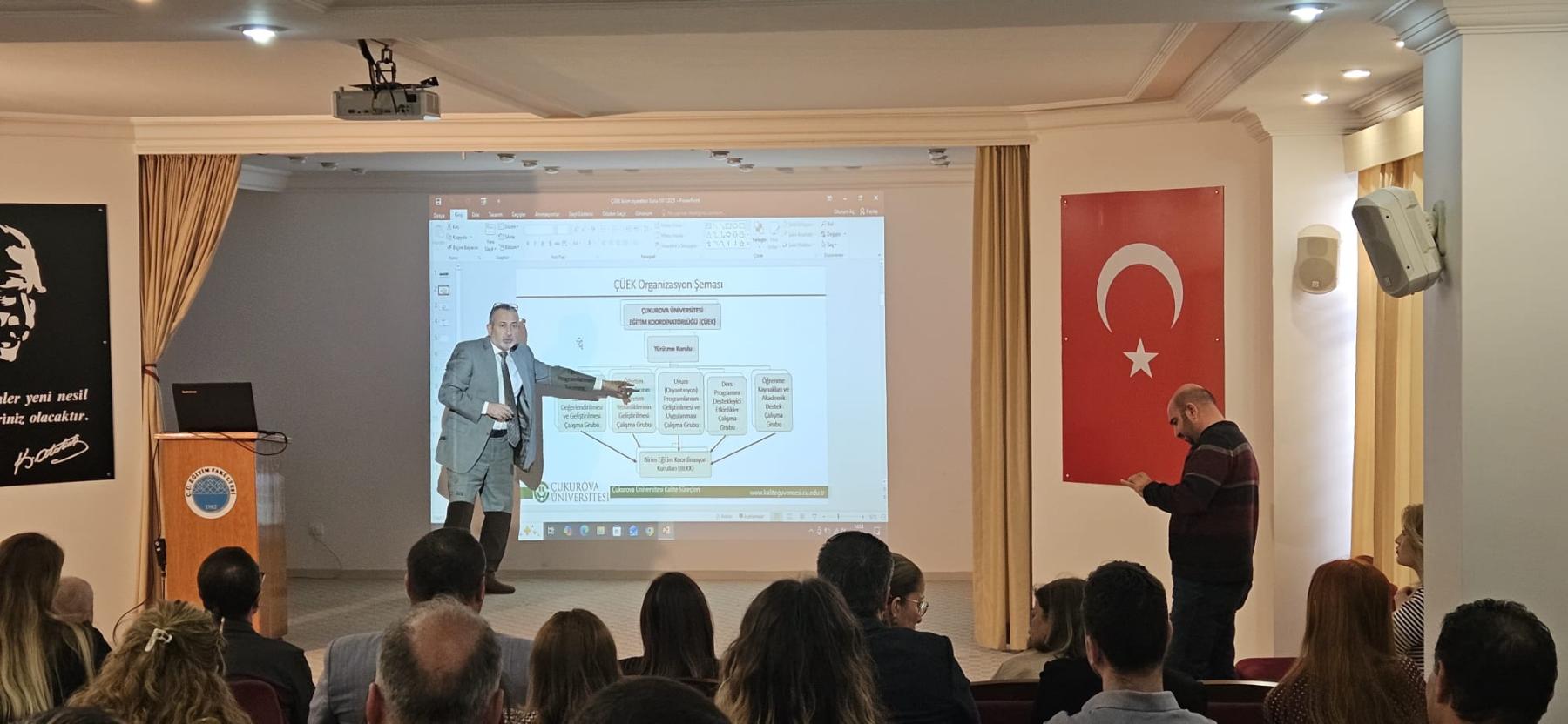 Yapılan ziyarette Fakültemiz personeline Kalite Yönetim Sistemi, Yükseköğretim Kalite Kurulu (YÖKAK) Ölçütleri YÖKAK 2025 Ara Değerlendirme Raporunda tespit edilen gelişmeye açık yönlerimizin güçlü yönlerimize dönüştürülmesi için yapılması gerekenler; ders içerikleri, ders öğretim ve ölçme sistemlerinin kalite süreçleri ile uyumu, PUKÖ döngüsünün önemi, kalite anlayışının özümsenmesi konularında bilgilendirme yapılmıştır.
